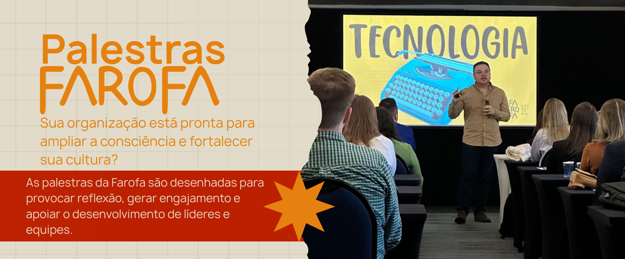 Nossas palestras são momentos de inspiração com direcionamento estratégico. Mais do que conteúdos prontos, desenvolvemos cada encontro a partir do contexto da sua empresa, conectando temas como cultura organizacional, liderança, bem-estar e futuro do trabalho. Com duração de 20 a 45 minutos, as palestras da Farofa provocam reflexão, ampliam perspectivas e geram movimento real dentro das organizações — seja em eventos corporativos, convenções ou programas internos.